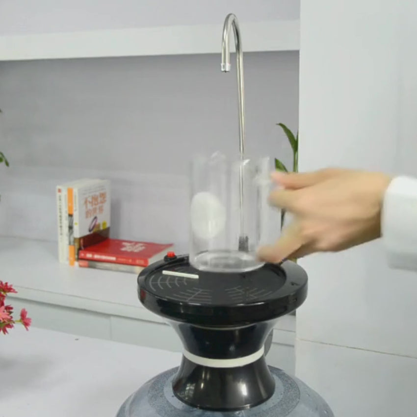 An electric water pump with a tray design for cup holding, one-click operation, and a 304 stainless steel outlet pipe, ensuring a healthy and durable drinking experience at home, office, gym, or events.