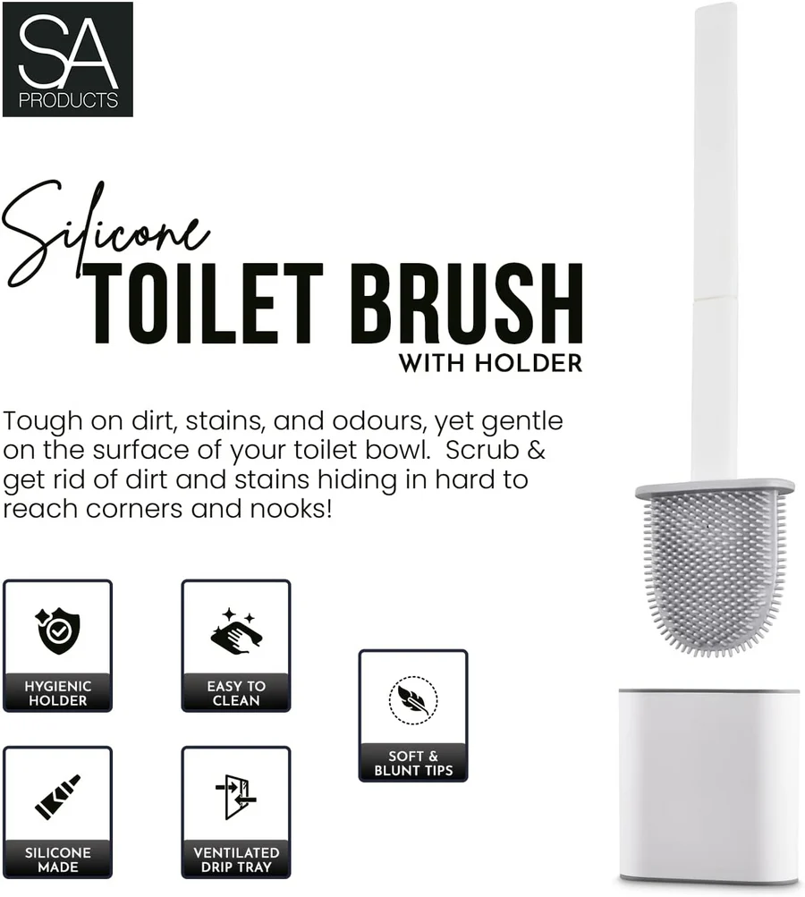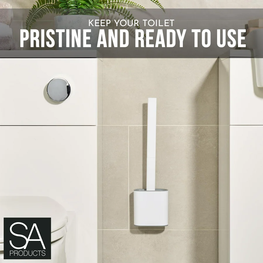 فرشاة مرحاض بسيليكون مرن ورأس مزدوج الجوانب، مع حامل جدار لاصق. تنظف 30% أفضل من الفرش التقليدية، وتصل إلى كل الزوايا. تصميم مجوف لتصريف المياه ومنع الروائح. مناسبة للمراحيض الغربية والهندية.